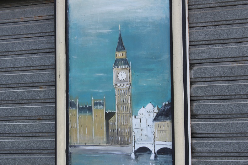 We wondered in the usual aimless way, looking for something that might be related to London - and whilst munching on a baguette, noticed the following artwork on a shop front: