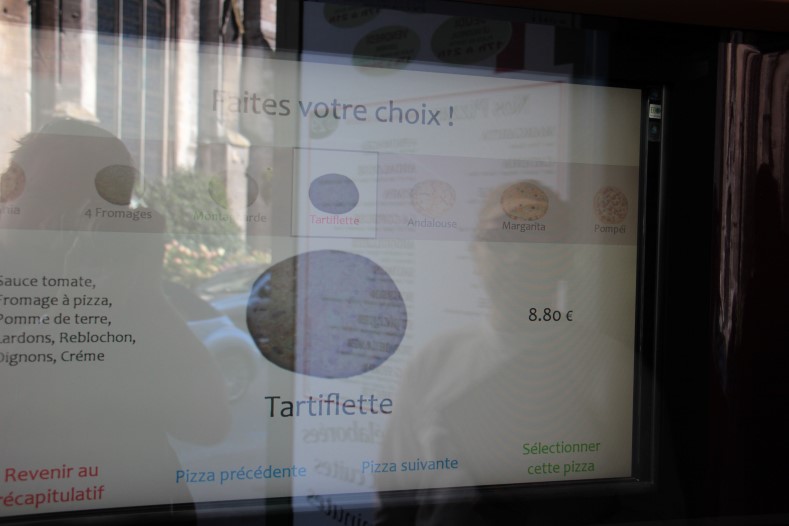 Having found that, we discovered it had a self service screen where you can select your pizza anytime day or night. So we selected our Tartiflette, paid our €8.80, and headed off for lunch!